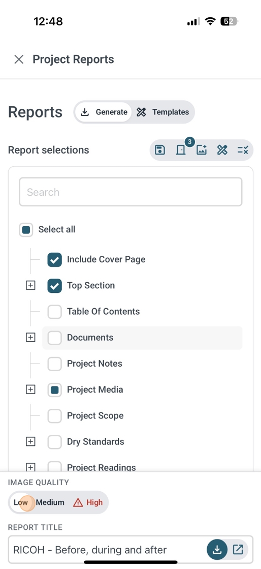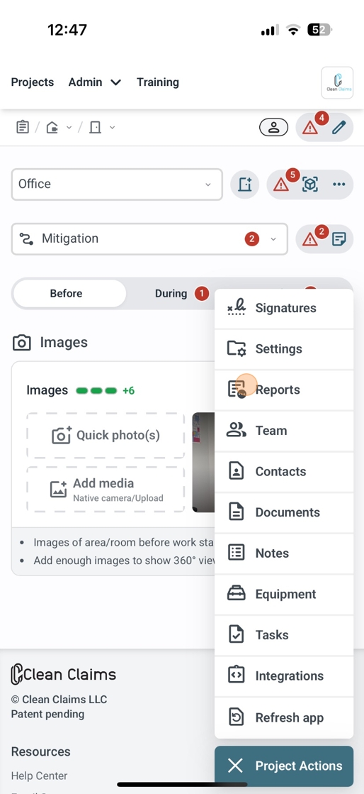 <br> Procedure for Selecting Photos in Reports 1. Access the Reports Section Log in to the Clean Claims platform. Navigate to the 'Reports' section. 2. Select Report Images Locate the top toggle labeled 'Select Report Images'. Click on ...