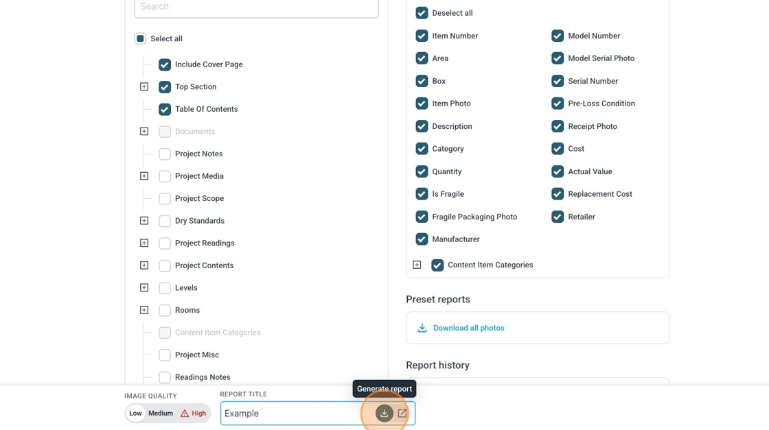 <br> Selecting Image Quality in Final Reports 1. Accessing the Final Report Feature Log in to the Clean Claims system at app.cleanclaims.com . Navigate to the section for generating final reports. 2. Selecting Image Quality ...